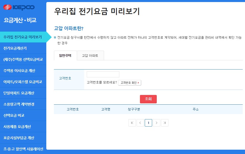 한국전력공사 사이버지점 홈페이지에 간단하게 전기요금을 조회할 수 있는 방법이 있습니다. 우리 집 전기요금 미리 보기에서 일반주택과 고압아파트를 선택해 주시고 고객번호를 기입하면 됩니다. 만약 고객번호를 모를 경우 고객번호 확인탭이 있는데 버튼을 눌러주면 알 수 있습니다.