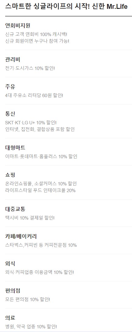 두 번째 방법은 전기요금 할인 카드를 쓰는 것입니다. 공과금이 10%까지 할인이 되는 카드가 가끔가다가 나오는데 대표적으로 신한 미스터라이프카드로 전기나 가스요금 10% 할인과 더불어 통신요금도 할인이 되는 카드입니다.